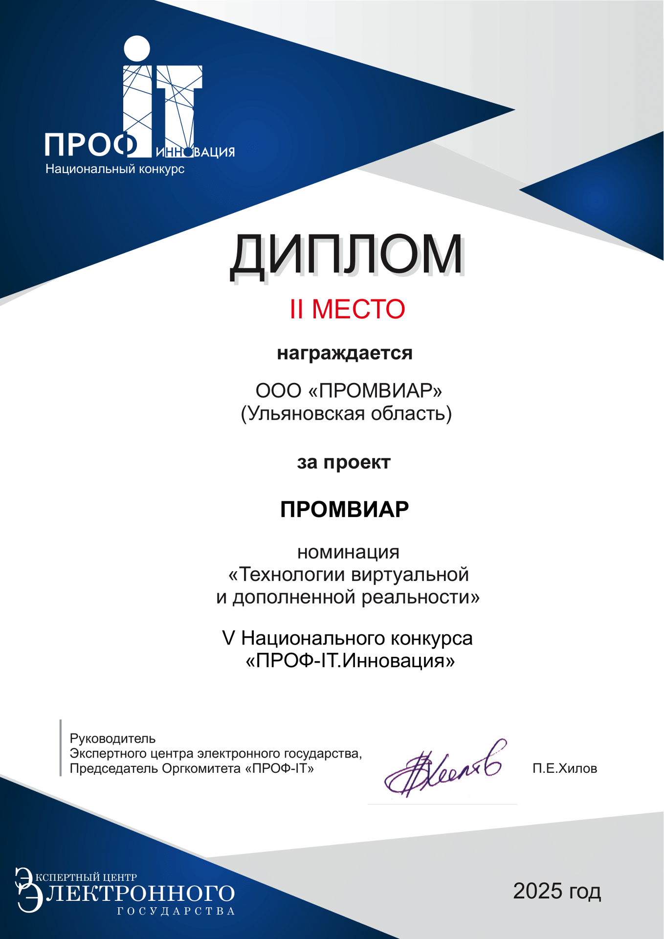 15 мая 2025 года команда ПРОМВИАР выступила в финале V Национального конкурса «ПРОФ-IT. Инновация» и завоевала 2-е место в номинации «Технологии виртуальной и дополненной реальности»!