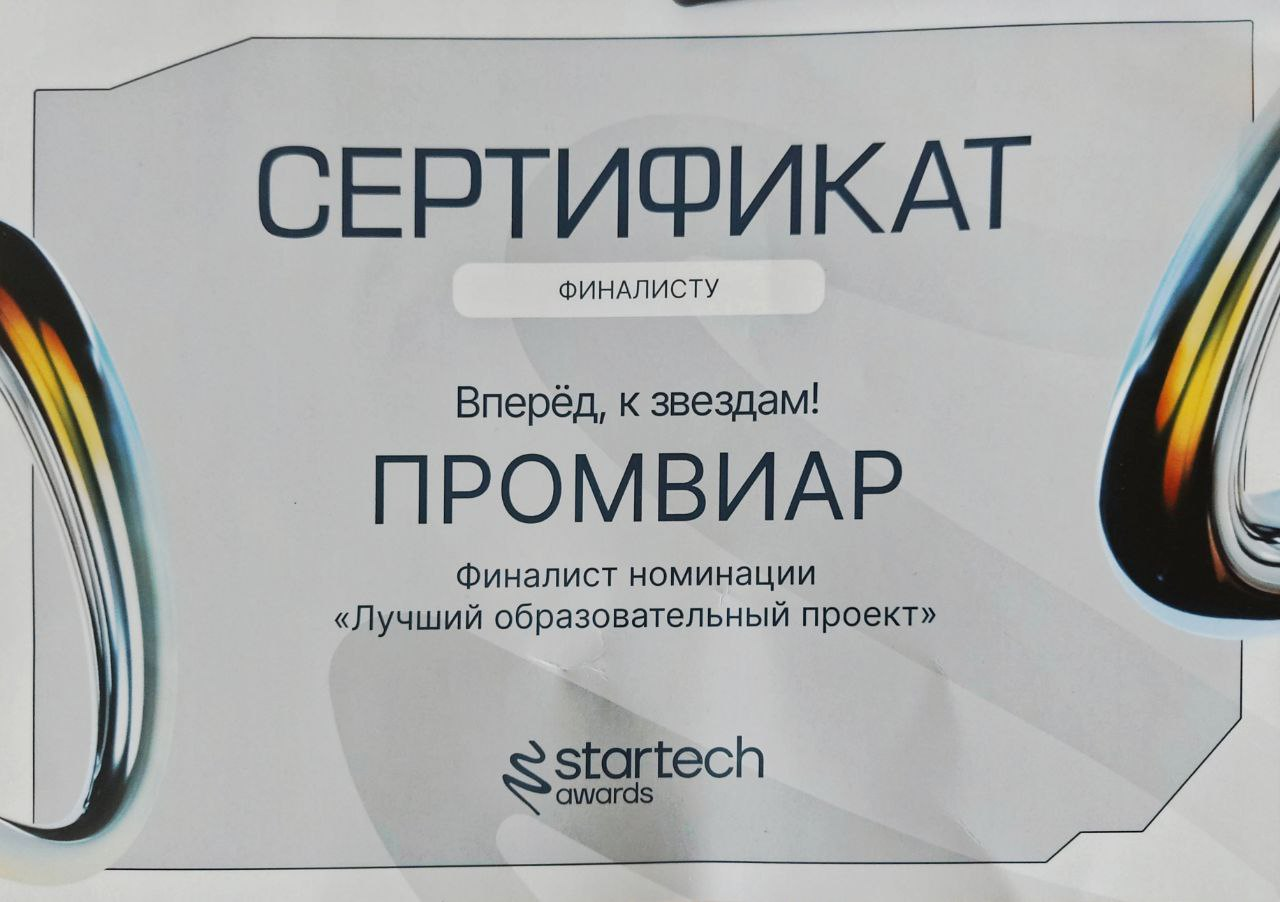 19 сентября команда PROMVR приняла активное участие в отраслевой конференции Startech.Awards 2025 для стартапов и начинающих предпринимателей. Ключевым достижением нашей команды стало выход в финал в номинации «Лучший образовательный проект», что подчеркивает признание нашего продукта экспертным сообществом и его потенциал на рынке!